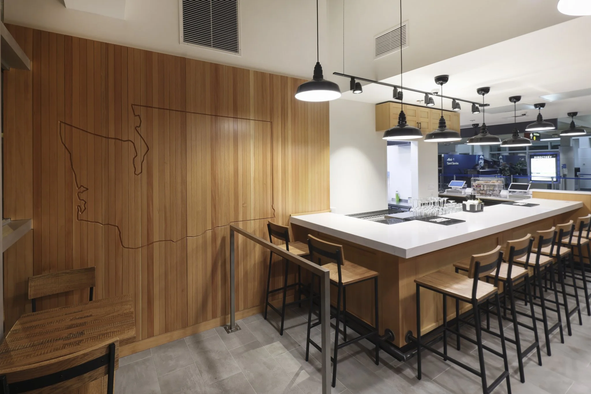 Ninth & Pike is a full-service bar and restaurant serving the traveling public in SEA’s Concourse C. The menu features locally-sourced, Northwest-inspired comfort food and refreshing specialty cocktails. Designed by Seattle-based architect Chin-Ley/Reche Associates and constructed by Seattle-based MJ Takisaki Inc, Ninth & Pike makes use of locally sourced end-cut logs and ample natural light to create a space that feels firmly rooted in the Pacific Northwest.
